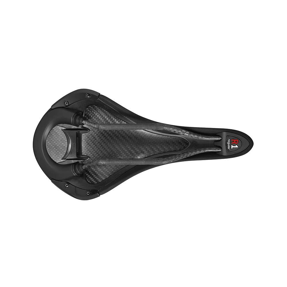 Une selle de vélo en carbone avec une coque en nylon TwinFlex co-injecté de carbone composite et une housse en microtex noir adhérent thermosoudé.