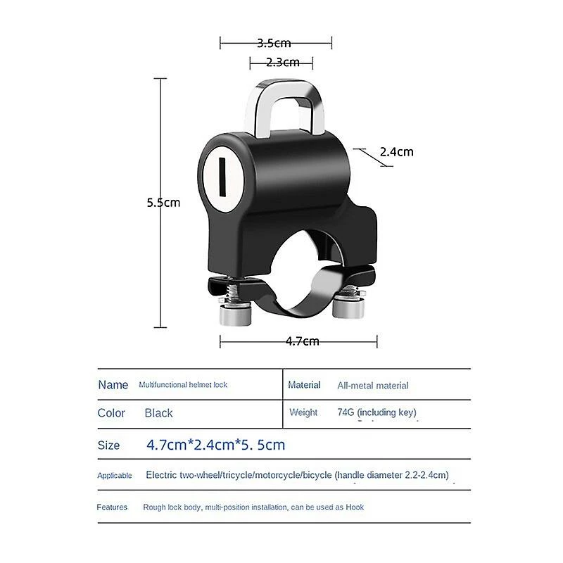 Specification: Mini portable single helmet lockSpecification: helmet lock equipped with reminder ropeMaterial: aluminum alloyApplicable range: 2.0-2.4 cmWeight: 100