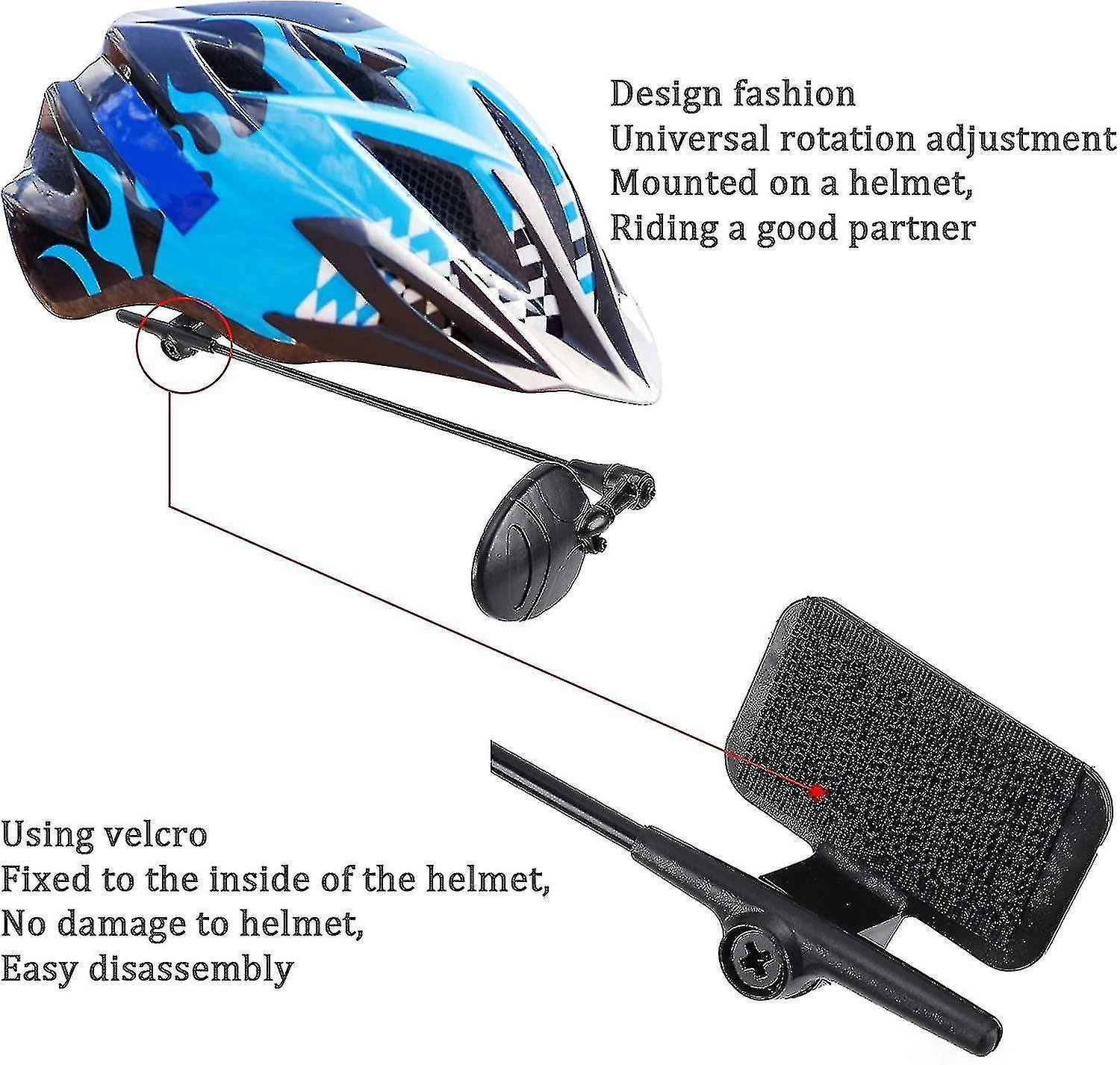 Description Adjustable – 360 degree rotation mirror, you can find the most suitable place to have a great view after several adjustments. The shaft length places the mirror at a perfect distance in front of you so it stays steady even during bumpy rides. Durable and clear view – ABS electroplating convex mirror. No risk on mirror breaking. Only having a glance of it, clear and wide vision easy to get. Easy installation – Tear down the white paper and stick on your helmet. Just line it up exactly where you want it, then lock in your preferred adjustment. Mounts on both left side right side with ease. (Note: Pls remove the transparent protective film on the mirror before use.) Lightweight mirror – Ultra-light to wear. The strong polymer construction makes this cycling mirror a perfect combination of ultra-strength feather weight. ONE SIZE FITS ALL. Application – It is used as a rearview mirror mounted on a riding helmet to improve safety during driving, provide you a funny and safe cycling.